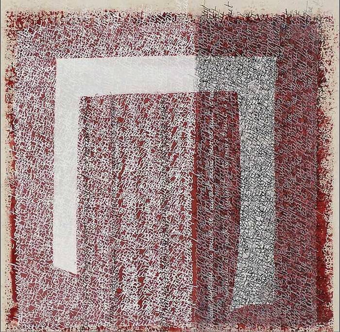 2008 Expo D Sylvestre Ecritures tissées n° 10 ← Précédent Suivant → le temps suspendu à la porte de l’auvent entre ciel et terre ; © Dominique SYLVESTRE