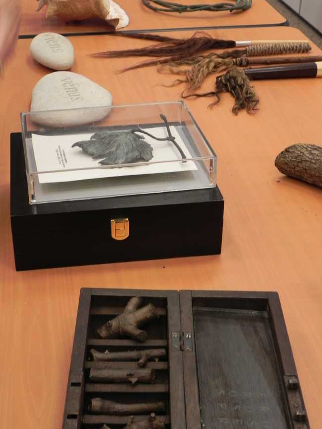 Etna Corbal « cabinet de curiosité » ← Précédent Suivant → « Viens Vénus » galets gravés en 2005 ; « parure de pré vénus de l’age du bronze », feuille de vigne en bronze, 2005