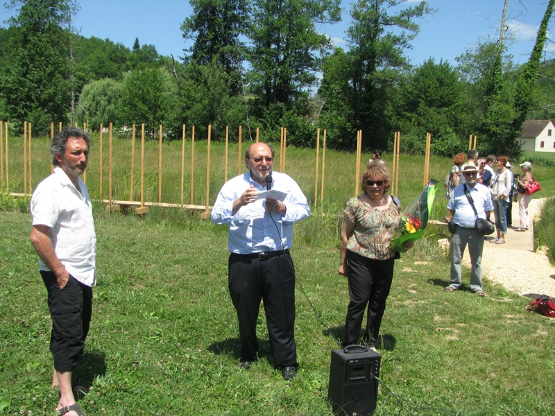 2015 A QUEYSSAC, Mr le Maire félicite Christophe GONNET ← Précédent Suivant → Christophe Gonnet ; Francis Papatanasios, maire de Queyssac ; Annie Wolff, présidente des Rives de l’Art