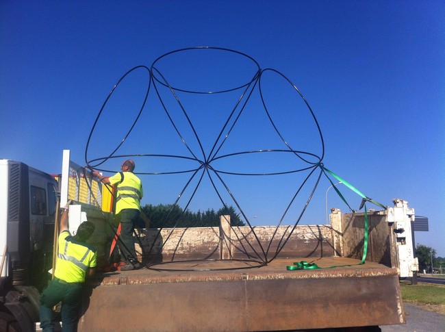 2015 EPHEMERES #5; Installation des oeuvres « les Frères, le Libre, et les Egaux » de Pierre Labat ← Précédent Suivant → Avec l’aide de la CAB, transport et installation des sculptures à Creysse ; Photo ©Pierre Labat