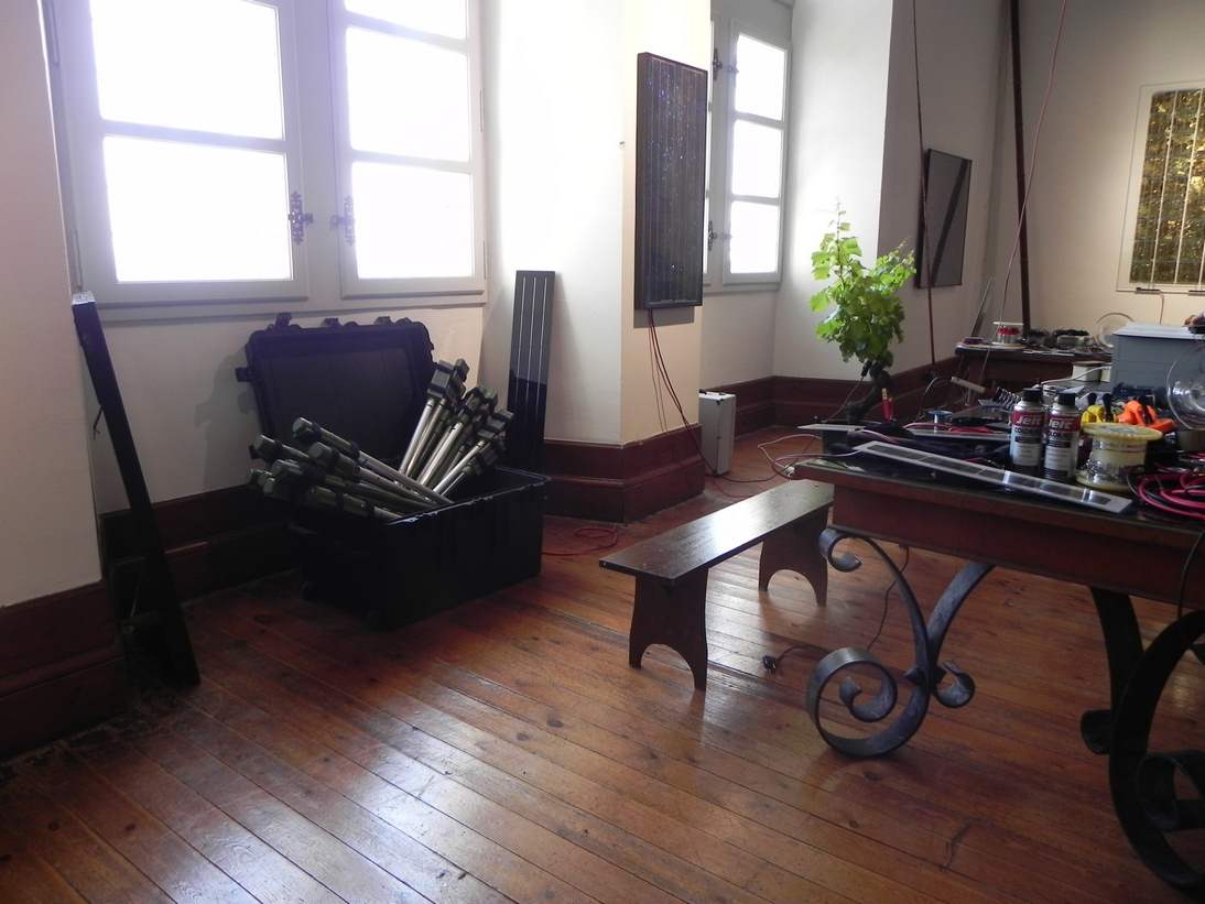 Atelier d’artiste dans lequel matériel divers, flûtes solaires, capteurs solaires côtoient aussi un pied de vigne relié à un capteur solaire…