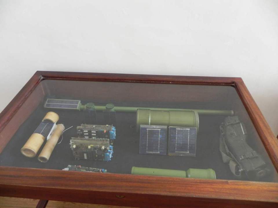 2015 « Studiolo » : oeuvre de Erik SAMAKH, EPHEMERES #5 ← Précédent Suivant → Vitrine : flûte solaire, robot solaire…, dans la petite salle d’exposition « Studiolo », Erik SAMAKH, 2015 ; expo de fin de « Résidence de l’Art en Dordogne »-Biennale EpHémères #5 ; château de Monbazillac ; photo ©Les Rives de l’Art.