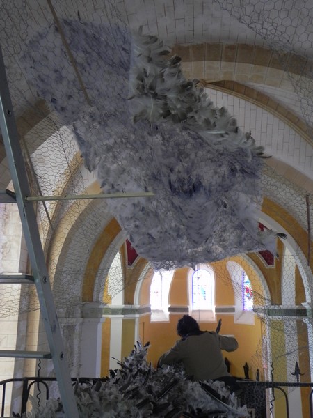 Yushin U Chang, installation de « Voltige » pour la Biennale Ephémères 2015, à Ste Alvère ; photo Les Rives de l’Art