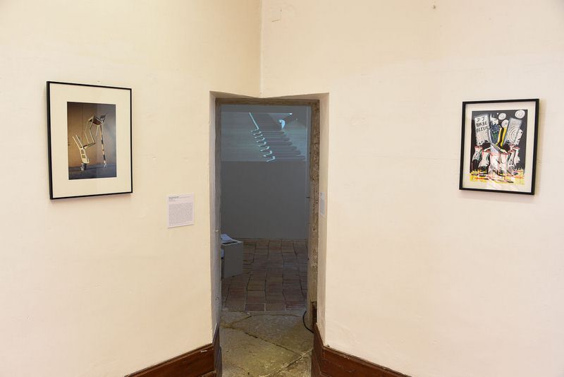 2015 Expo Frac Partition visuelle 12(©Alain Vergez) ← Précédent Suivant → « Les Hors-la-loi » de FISCHLI et WEISS ; « DJ Barbe-Bleue » d’Alain SÉCHAS ; au centre, détail de la vidéo « Untitled (colored penscils, table) » de Marie COOL Fabio BALDUCCI ; crédit photos ©Alain Vergez