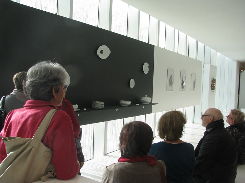 2016 le car est ouvert : visite de l’expo du PIP aux Eyzies ← Précédent Suivant → devant l’œuvre de Cécile Meynier, vaisselle cassée et reconstituée …