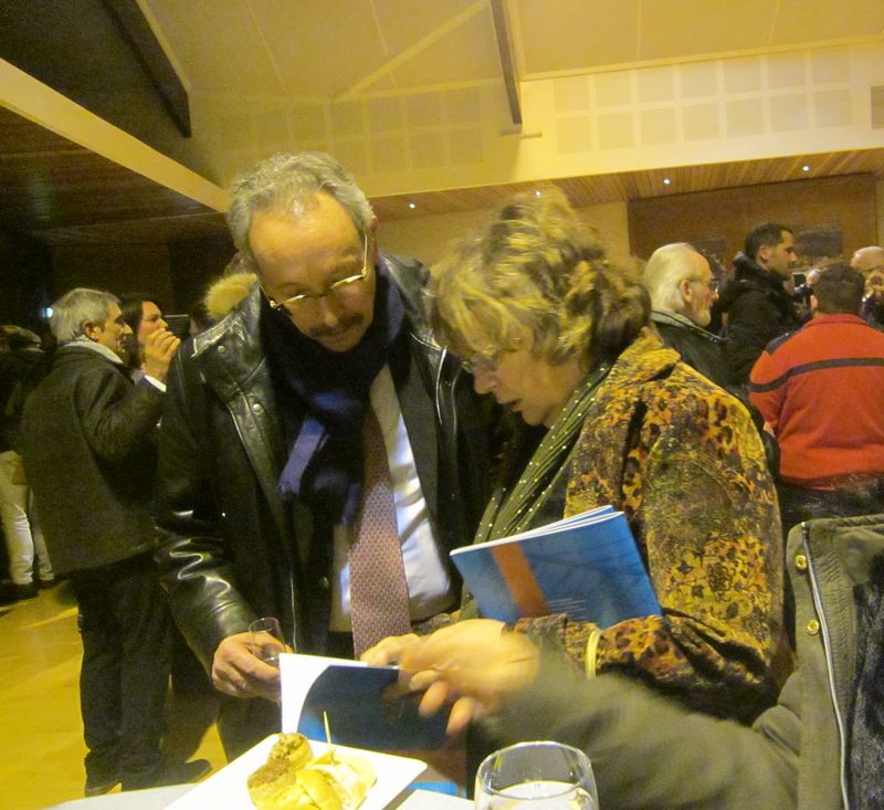 Remise du Prix 2017 du Fonds MAIF pour l’Education : Annie Wolff, présidente des Rives de l’Art (2nd Prix national) et Alain Pennel, trésorier du FME, feuillettent le catalogue de la Biennale épHémères 2017 ; 30 novembre 2017 à Montmélian en Savoie