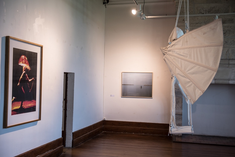 2018 EXPO Frac Limousin Monbazillac ©Alain VERGEZ (15) (Copier) ← Précédent Suivant → de G à D : Daniel Firman, série de 3 photographies ; autoportrait de Gilles Mahé en lampadaire ; Jean Bonichon, « Hors-limites »; « Expériences de vol » de Kristina Depaulis