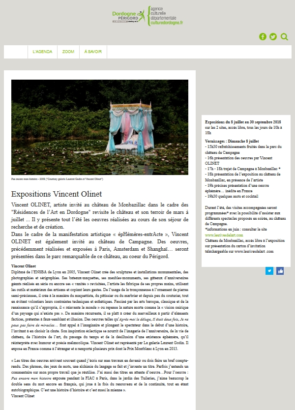 Expositions Vincent Olinet, 8 juillet-30 septembre 2018 en Dordogne-Périgord ; exposition de fin de « Résidence de l’Art en Dordogne » au Château de Monbazillac ; épHémères-entrActe, 4 ème édition : au Château de Campagne du Bugue, présentation en extérieur d’œuvres exposées précédemment à Paris, Amsterdam, Shangaï..