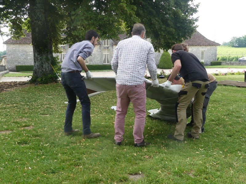 2019 EPHEMERES Installation Felice Varini Chateau Monbazillac (12) ← Précédent Suivant → préparation du 2nd assemblage pendant qu’un groupe tient la 1ère partie
