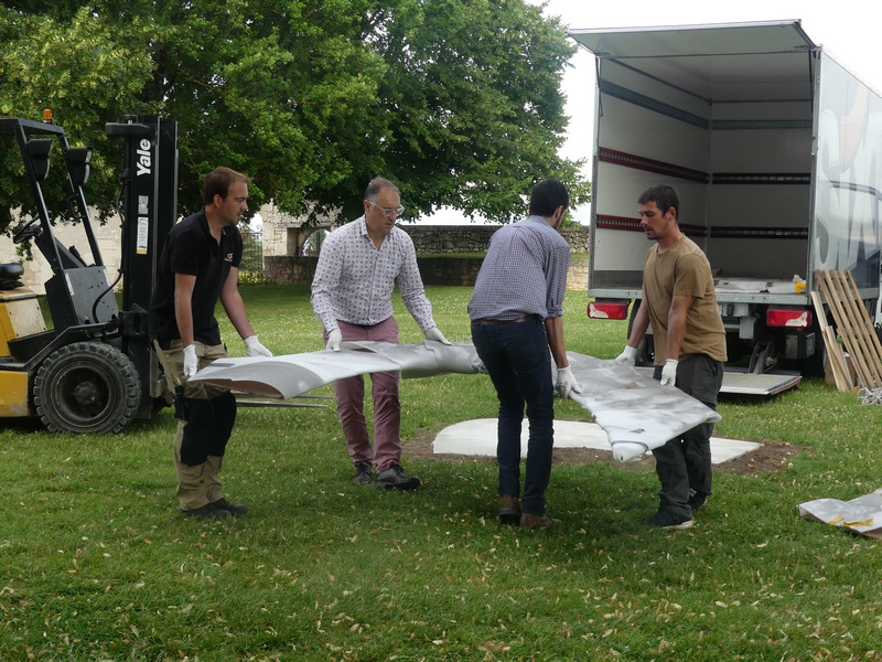 2019 EPHEMERES Installation Felice Varini Chateau Monbazillac (3) ← Précédent Suivant → Déchargement des différentes parties de la sculpture