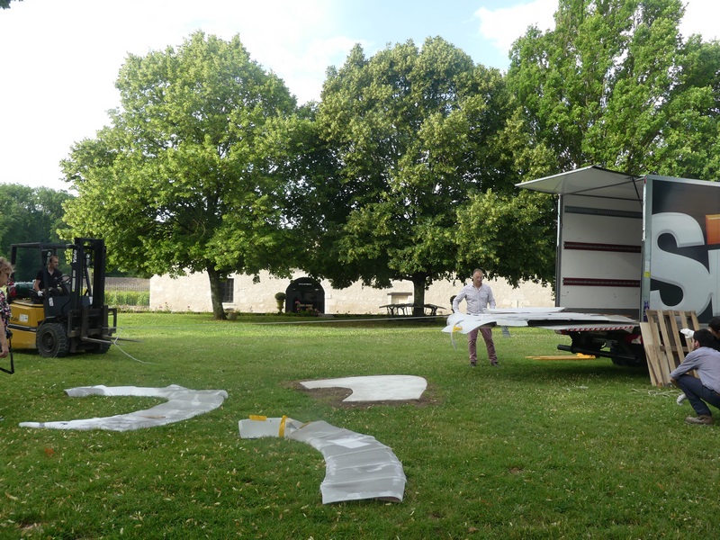 2019 EPHEMERES Installation Felice Varini Chateau Monbazillac (5) ← Précédent Suivant → Le transpalette entre en action : d’abord, tirer avec des cordes