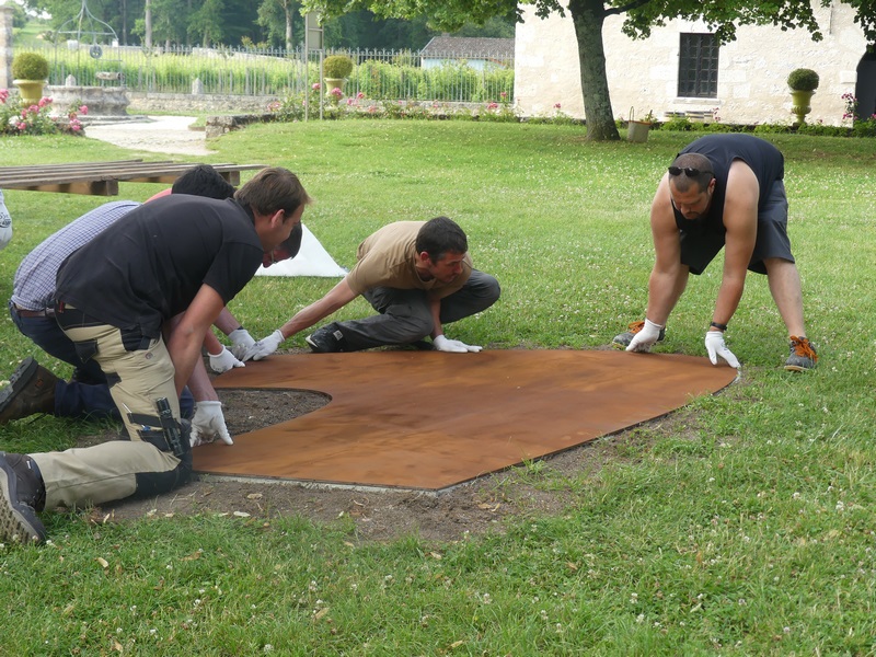 2019 EPHEMERES Installation Felice Varini Chateau Monbazillac (7) ← Précédent Suivant → Il faut placer précisément la base de la sculpture sur le socle