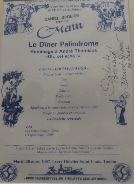 2019 exposition l’art mange l’art au musée Regards de Provence (14) ← Précédent Suivant → Daniel SPOERRI, le menu du repas palindrome de Spoerri