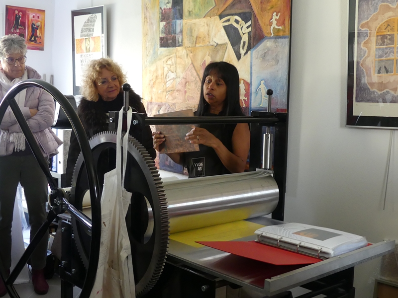 2019 visite de l’atelier de Rosario MARRERO (5) ← Précédent Suivant → gravure sur plastique de zinc… sur plaque de plexis ou de tetra-pack…. et impression à la presse….