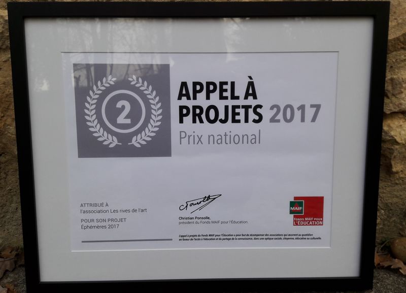 2017 Les Rives de l’Art 2nd Prix national du Fonds MAIF pour l’Education pour le projet EPHEMERES 2017. Ce prix récompense l’implication des Lycéens en Réalisation Chaudronnerie Industrielle 1ère année (RCI-1) du Lycée des Métiers Sud Périgord de Bergerac dans la Biennale épHémères 2017.
