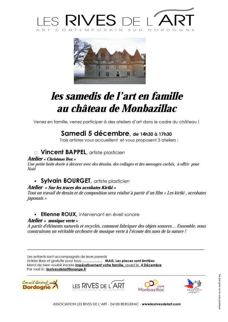 Affiche Samedi de l’Art en Famille 05 12 2015 avec Vincent BAPPEL, Sylvain BOURGET, Etienne ROUX : assocation Les Rives de l’Art au château de Monbazillac
