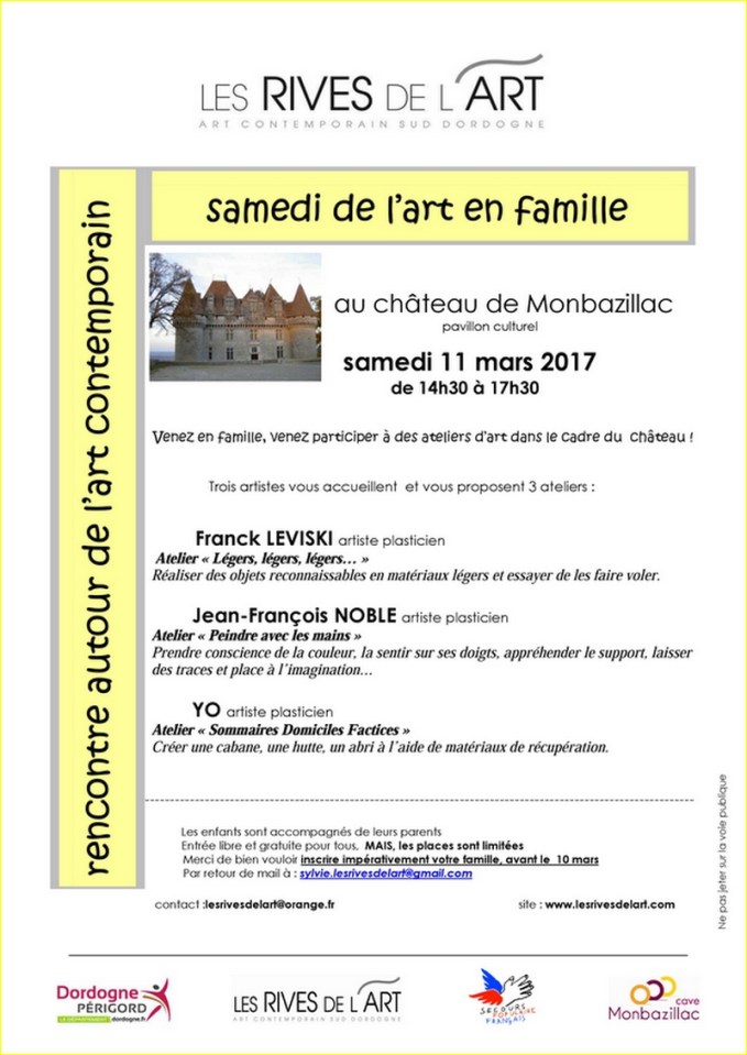 Les Rives de l’Art, Samedi de l’Art en famille, ateliers menés par 3 artistes : Franck LEVISKI, Jean-François NOBLE, YO ; 11 mars 2017 au Château de Monbazillac