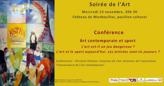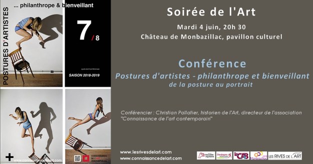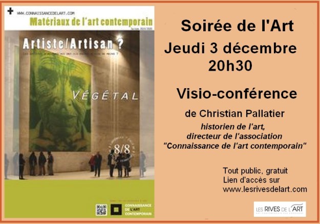 Les Rives de l’Art s’adaptent à la « distanciation sociale » et vous proposent un cycle de 4 conférences en mode visio-conférences : « Matériaux de l’art contemporain : Artistes/artisans ? » Mercredi 6 mai 2020 : Terre Mercredi 20 mai 2020 : Céramique Mercredi 3 juin 2020 : Textile Mercredi 17 juin 2020 : Bois Conférencier : Christian Pallatier, historien de l’art, commissaire indépendant, directeur de l’association Connaissance de l’Art contemporain. → En raison des circonstances, ces Soirées de l’Art, en accès gratuit, sont réservées aux adhérents et donateurs 2020 qui recevront par mail un lien d’accès à chaque visioconférence sur la plateforme ZOOM.♦ Mardi 28 janvier Soirée de l’Art