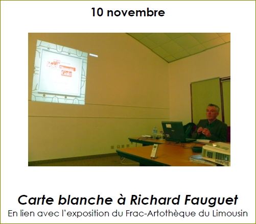 Conférence de Yannick Miloux, directeur du Frac-Artothèque du Limousin, en lien avec l’exposition « Carte blanche à Richard Fauguet » présentée au Frac Limousin fin 2016 ; au pavillon culturel du château de Monbazillac ; Les Rives de l’Art