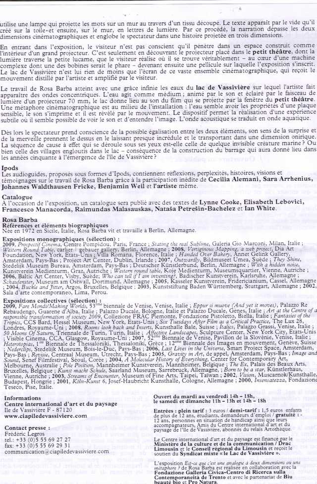 « Le travail de Rosa BARBA atteint avec une grâce infinie les eaux du lac de Vassivière sur lequel l’artiste fait apparaître des ondes concentriques. L’eau agit comme un médium ; animé par le son et éclairé par le faisceau de lumière d’un projecteur 70 mm, le lac donne lieu au son du film qui se projette par la fenêtre du petit théâtre… l’eau semble avoir les propriétés d’une plaque sensible, le son s’imprime et il est révélé par le mouvement… L’onde acoustique se traduit en onde aquatique. »