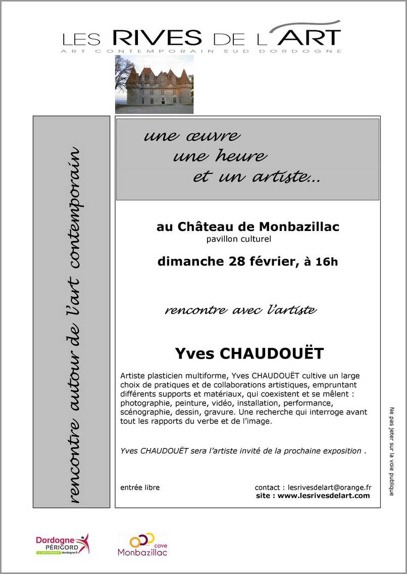 2016 Rencontre avec Yves Chaudouët invitation ← Précédent Suivant → « Une oeuvre, une heure, un artiste » : rencontre avec Yves CHAUDOUËT, 28 février 2016