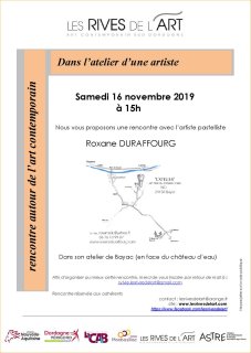 La visite de l’atelier de Roxane Duraffourg par les adhérents des Rives de l’Art fut une belle et agréable découverte. Artiste résolument « réaliste », Roxane Duraffourg traduit ses ressentis, ses émotions avec des outils très variés : pastel mais aussi fusain, huile, aquarelle ou gravure croquent des paysages, portraits, natures mortes aux lignes marquées et au style épuré.