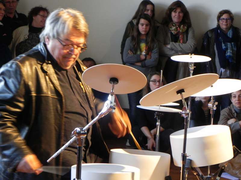 2016 2 avril Bernard LUBAT joue de la « batterie fragile » d’Yves CHAUDOUËT lors du vernissage de l’exposition Yves CHAUDOUET au château de Monbazillac ; © Les Rives de l’Art 2016