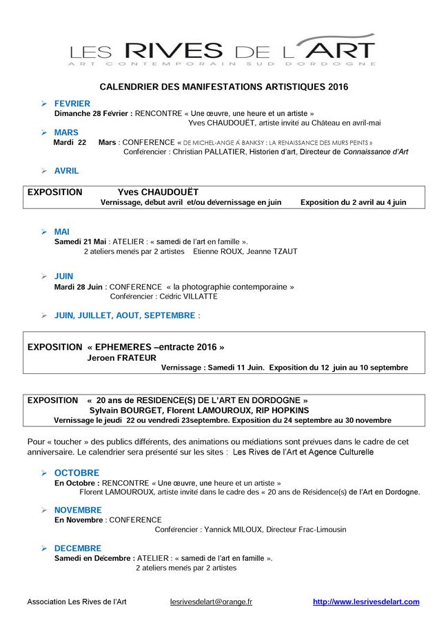2016 Programme artistique des Rives de l’Art au Château de Monbazillac