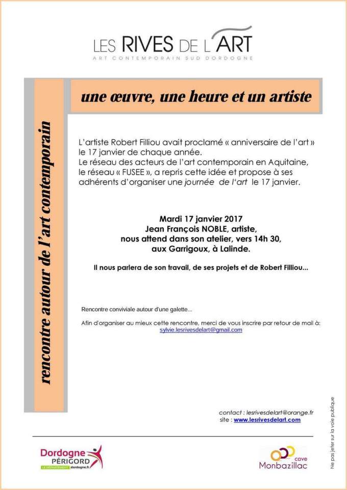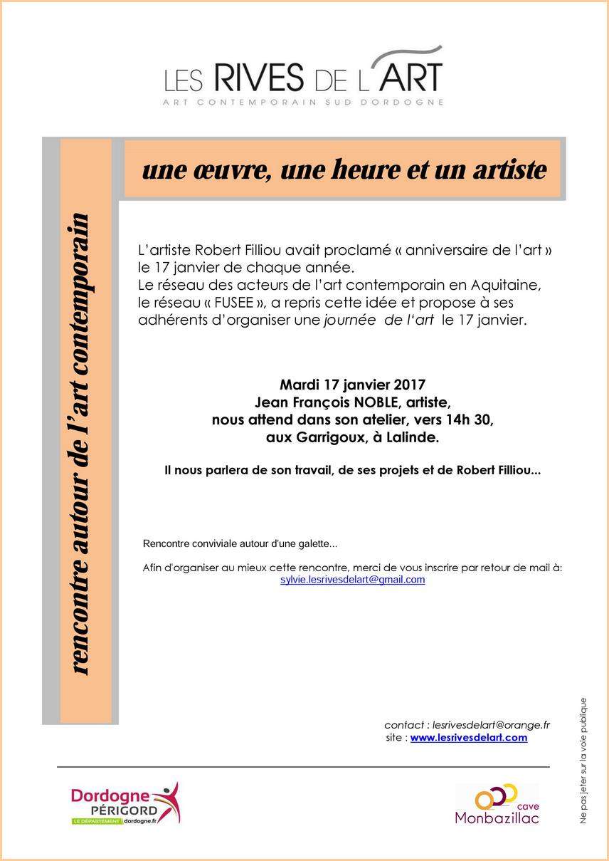 Le réseau FUSEE, réseau des acteurs contemporains d’Aquitaine, a proposé une Journée de l’art, le 17 janvier 2017, en hommage à l’artiste Robert FILLIOU qui décréta le 17 janvier « anniversaire de l’art », en 1963. A cette occasion, Les Rives de l’Art organisent une rencontre avec l’artiste Jean-François NOBLE dans son atelier de Lalinde (Dordogne-Périgord)