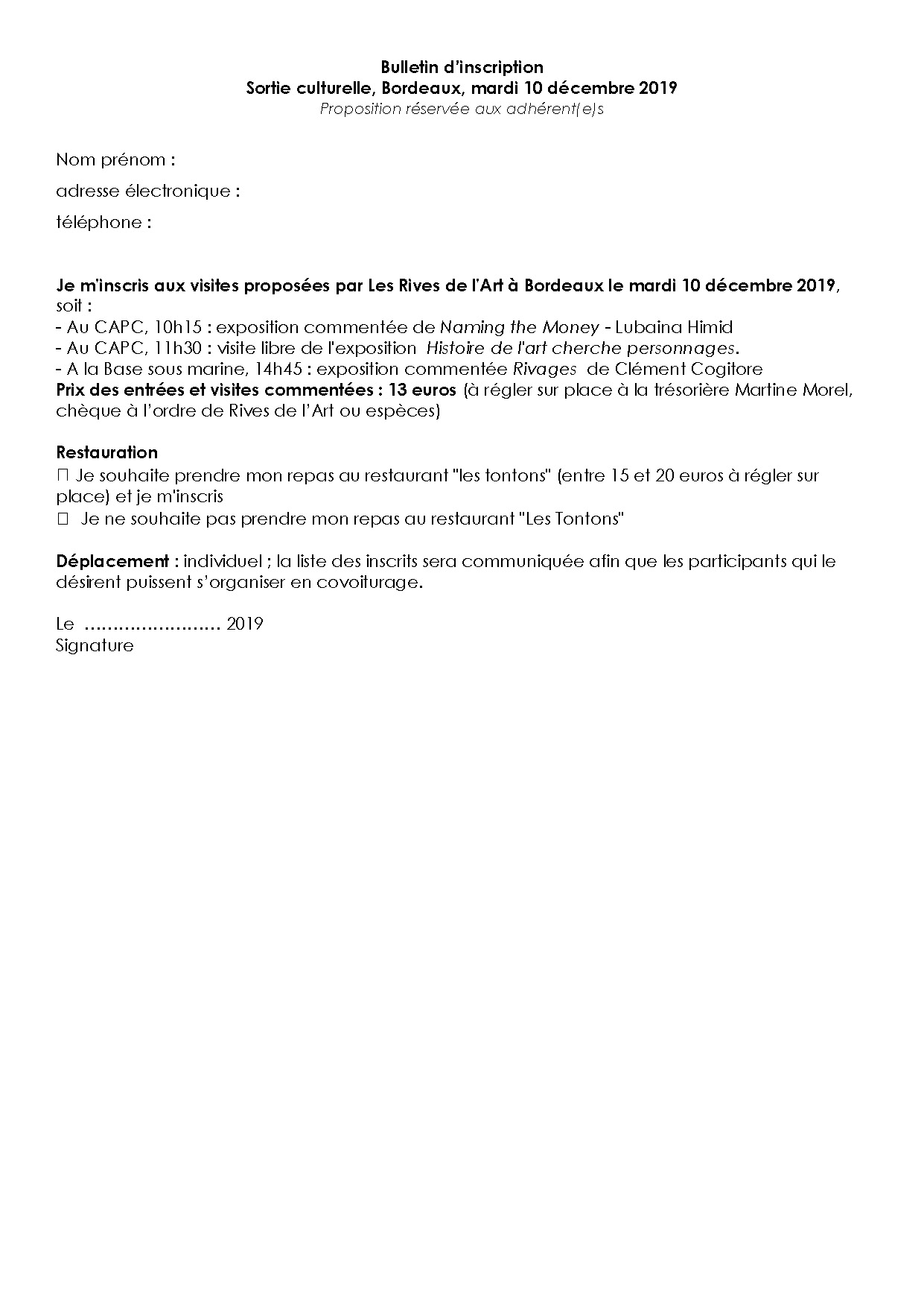 2019 Sortie culturelle Bordeaux 10 décembre Bulletin d’inscription ← Précédent Suivant → Clic… Bulletin d’inscription Sortie culturelle Bordeaux 10 décembre 2019