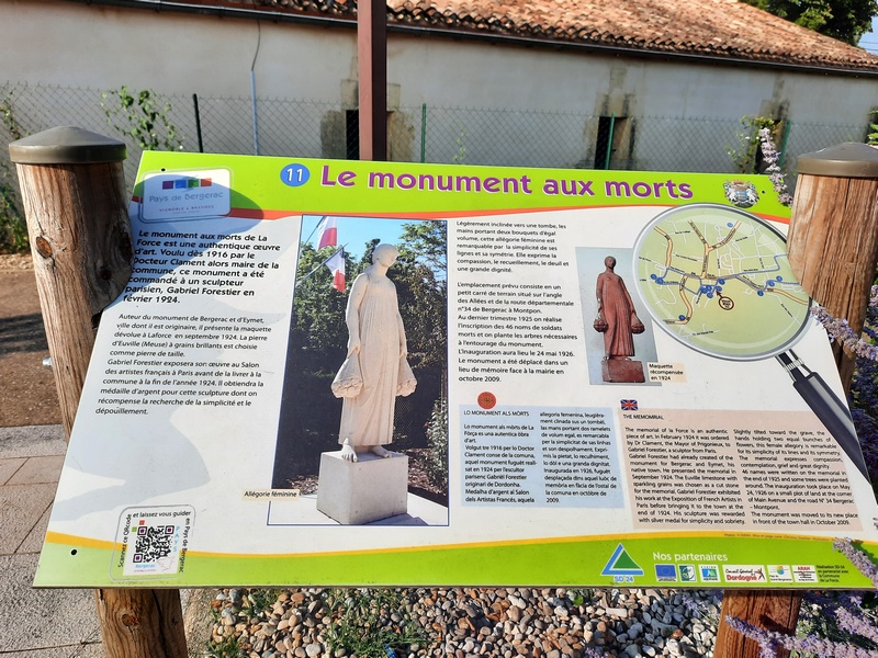 - le monument aux morts de La Force présenté par Marie-Thérèse Trouillard, secrétaire de l’ARAH. Il fut créé en 1924 par Gabriel Forestier, artiste parisien qui sculpta aussi, entre autres, les monuments aux morts de Bergerac et d’Eymet dont il était originaire.