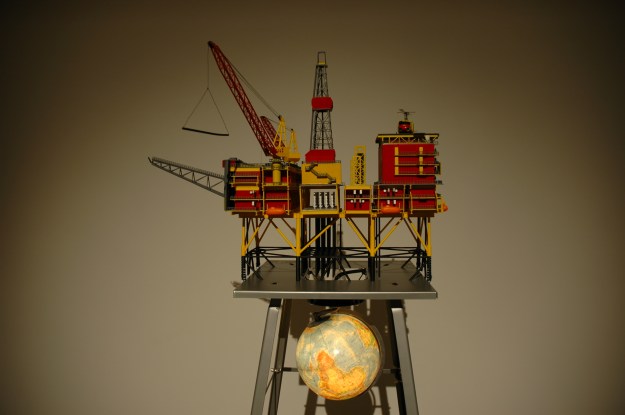 Ce bricoleur surdoué s’attaque à différents formats, peu encombrants (dessins, vidéos, livres d’artiste…) ou de grande dimension, comme ces « maquettes » ambitieuses de projets sans doute irréalisables. Ainsi Follow me (un avion, une architecture, un écran d’ordinateur…) pourrait devenir une sculpture géante destinée à un aéroport. Quant à Shell Platform (un socle portant une plateforme pétrolière surmontant elle-même un globe terrestre inversé), il s’agit d’une œuvre emblématique de son travail, à la fois ludique et interpellant, qui a été acquise par le FRAC-Artothèque Nouvelle-Aquitaine. Le globe terrestre, aux proportions bien moins impressionnantes que la plateforme qui le surmonte, est sens dessus dessous. Le pétrole, métaphore de la mondialisation économique et polluante, est solidement campé sur une planète inversée. L’avenir ?