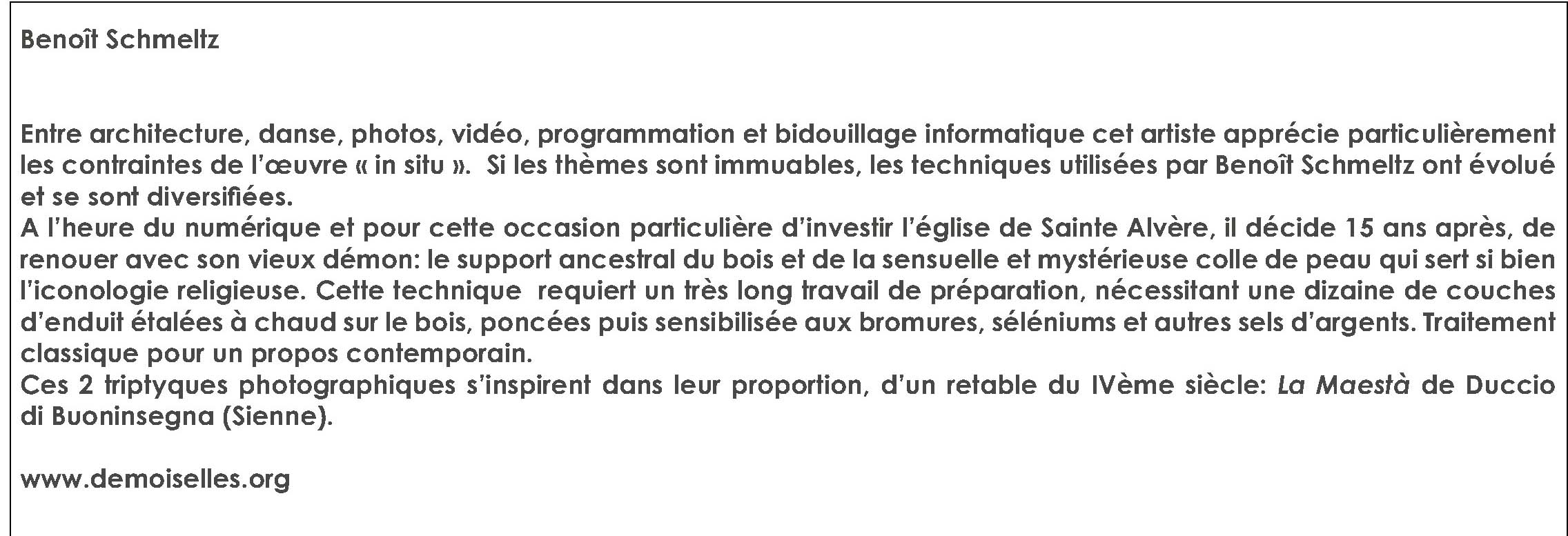 Dans cette traversée de la Dordogne, faisons un détour par l’église de Sainte-Alvère, où le plasticien Benoît Schmeltz donne à voir deux photographies argentiques tirées sur panneau de bois grand format, inspirées de la légende d’Alvéréna, jeune martyre du ixe siècle ayant donné son nom au village. Rencontre.