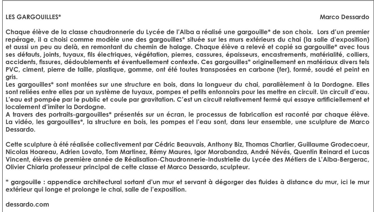 A Creysse, dans l’ancien chai, entre mairie et rivière, Marco Dessardo et les apprentis-chaudronniers du Lycée des métiers de l’Alba, allient les techniques fondamentales de chaudronnerie à l’imagination et l’ingéniosité pour créer une sculpture de 35m de long. Hydraulique et mécanique, elle fait naître le bruit de l’eau en évoquant la rivière toute proche.