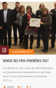 Pour les Rives de l’art, ces prix récompensent en particulier l’implication des élèves apprentis-chaudronniers du Lycée des métiers Hélène DUC – Sud Périgord de Bergerac dans la réalisation d’une des œuvres artistiques de la Biennale épHémères 2017 (œuvre de Jean-François Noble au barrage EDF de Tuilières/St Capraise de Lalinde).