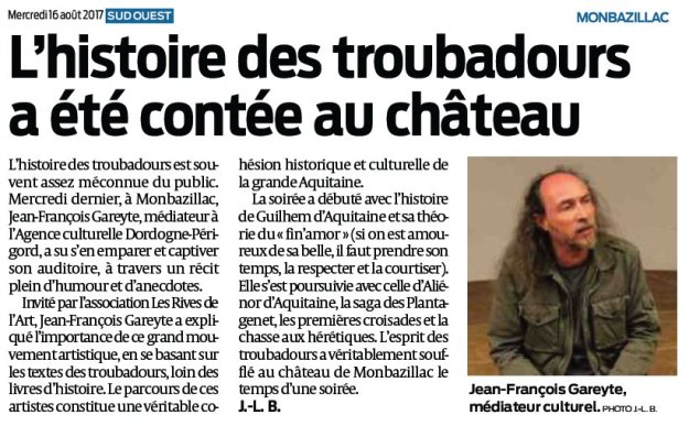 Après avoir balayé l’histoire de l’Aquitaine sous les Wisigoths et Jules César afin de comprendre les différences de cultures entre les Aquitains (qui parlaient occitan, dont le territoire allait de Poitiers aux Pyrénées en s’étirant vers l’Auvergne et pour lesquels une femme pouvait diriger le duché) et les Francs (minuscule territoire autour de Paris, succession uniquement masculine) Jean-François Gareyte a mené le public au temps de Guilhem IX, Duc d’Aquitaine, dont les médiévistes disent qu’il est l’initiateur des troubadours et le créateur du « fin’amor » (écouter, courtiser, respecter la femme quand on est amoureux).