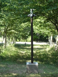 – remontez vers la forêt le long du court de tennis par l’allée de charmille, vous rencontrerez d’abord l’œuvre de Christophe DOUCET, 4 lièvres aux oreilles nouées au centre d’une charmille.