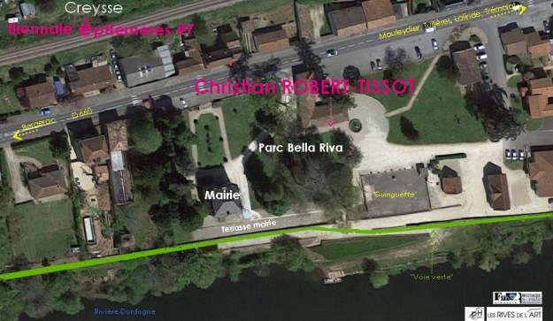 Pour épHémères, le gigantesque Grand public, acquis par le Frac-Artothèque Nouvelle-Aquitaine, soulignera (en toute transparence) la façade arrière de la mairie de CREYSSE, sur la terrasse Bella Riva, face à la Dordogne, à deux pas de la Voie verte.