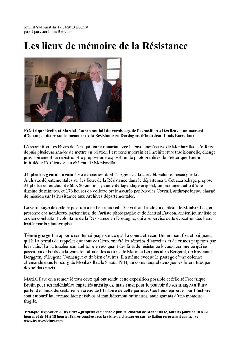 L’artiste photographe Frédérique BRETIN et Martial FAUCON, ancien journaliste et ancien combattant volontaire de la Résistance en Dordogne, ont fait du vernissage de l’exposition « des lieux » un moment d’échange intense sur la mémoire de la Résistance en Dordogne.