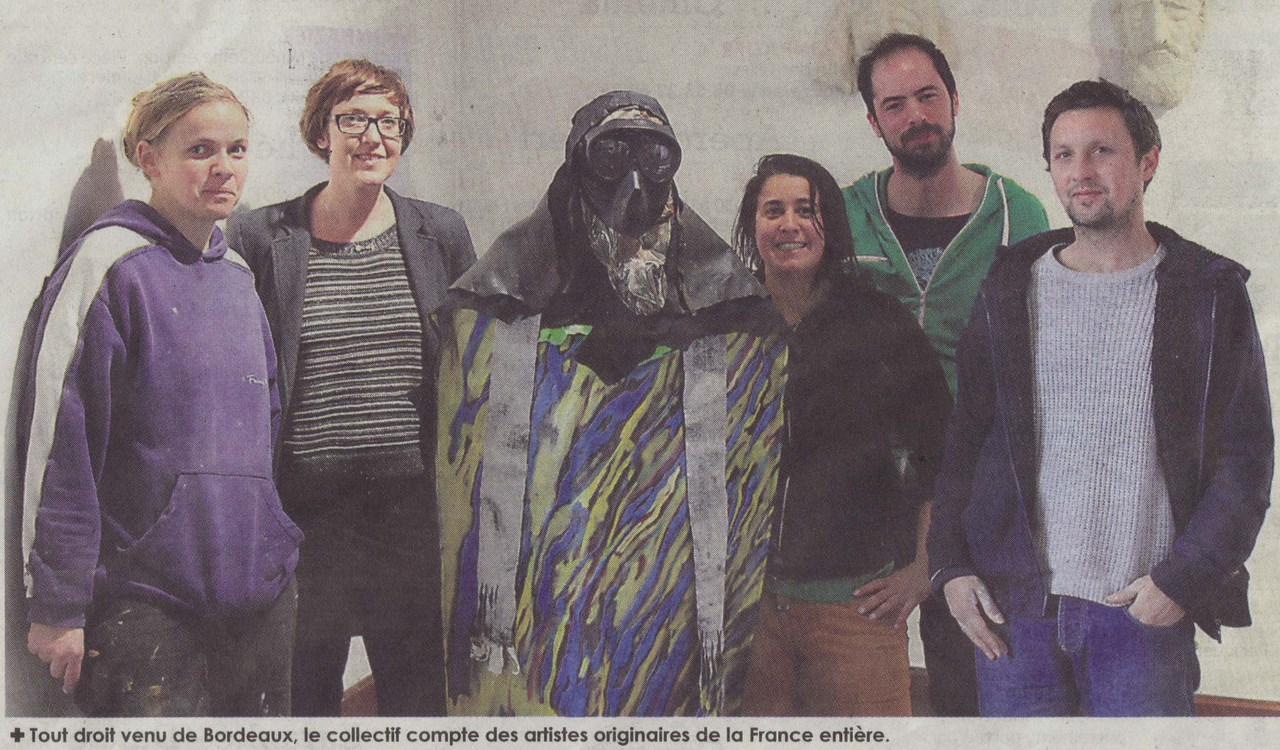 Lors du vernissage, les artistes du collectif La Mobylette mènent les visiteurs à travers parc et château. Ils content l’histoire revisitée de la famille Bacalan à un public séduit par l’originalité de la démarche.