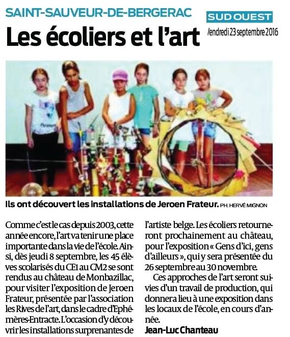 2016 épHémères-entrActe médiation école de St Sauveur Sud Ouest 23 sept ← Précédent Visite des écoliers de St Sauveur à l’exposition Jeroen Frateur ; article Sud Ouest 23 sept 2016