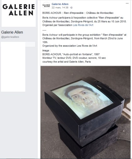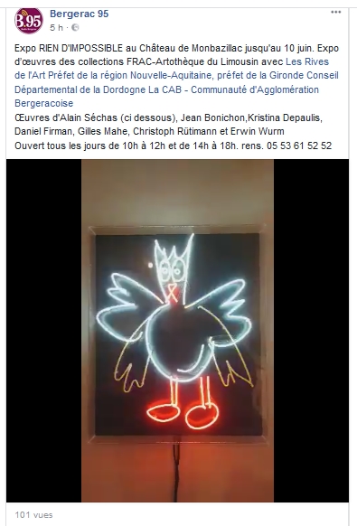 Capture d’écran le 26 mars 2018 : Bergerac 95 sur Facebook. Vidéo d’Alain Séchas pour l’exposition « Rien d’Impossible »