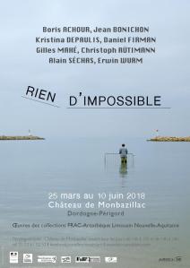 Sur un beau format de paysage portuaire, au centre de l’image, un personnage de dos s’appuie sur une rambarde anti émeutes, les pieds dans l’eau, face à l’horizon lointain. Il s’agit de Jean Bonichon lui-même, qui a attendu la marée montante pour mettre en scène cette image et fixer ce moment improbable. L’artiste creusois a débuté ses actions et performances dès ses années d’étude à Clermont-Ferrand, puis à Nantes. Sculpteur et scénographe, il se met souvent à l’épreuve sans crainte du ridicule, dans la tradition de Buster Keaton ou de Jacques Tati. Le titre de cette oeuvre, « Hors limites », est comme un clin d’oeil à la fameuse exposition du même nom, sous-titrée « L’art et la vie, 1952-1994 », qui eut lieu au Centre Pompidou en 1994.