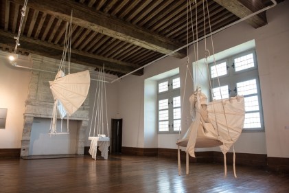 « Lors de la première visite de repérage au château, invités par l’association les Rives de l’Art et la Cave de Monbazillac, nous nous sommes vite retrouvés autour de la présentation de trois sculptures de Kristina Depaulis. Autour de ces « expériences de vol » suspendues au plafond qui se déploient majestueusement dans l’espace, un ensemble d’œuvres de trois générations d’artistes liés à la performance et à sa mise en scène montre une part de l’évolution de cette discipline depuis trente ans.