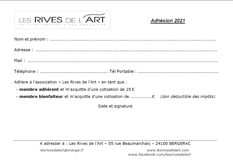 > Envoyer bulletin d’adhésion et chèque à l’ordre des Rives de l’Art à cette adresse :