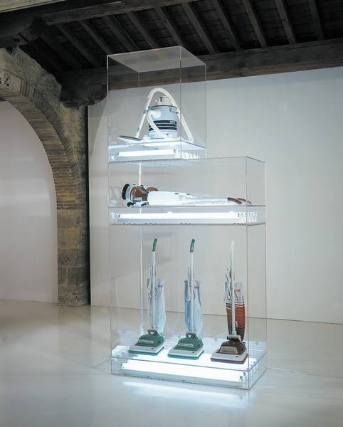 Trois aspirateurs, deux cireuses et un aspirateur à eau sont disposés dans une vitrine en Altuglas, sur trois niveaux et éclairés par des néons.