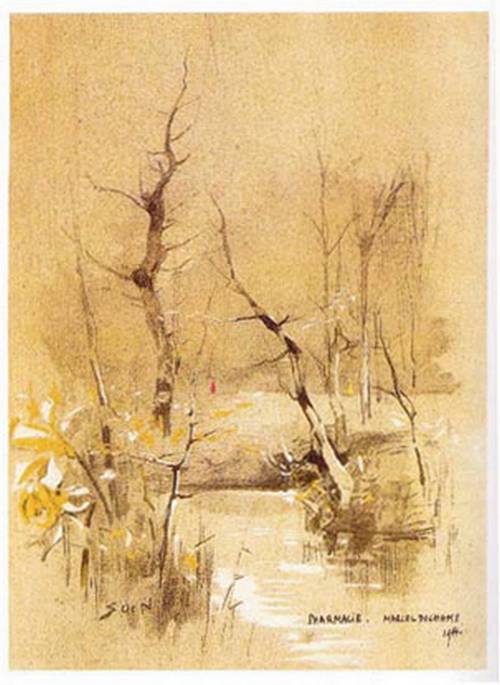 En janvier 1914, avec humour, Marcel Duchamp réutilise une œuvre en lui apportant une touche de jaune et une touche de rouge, puis il la re-signe et la renomme « Pharmacie »