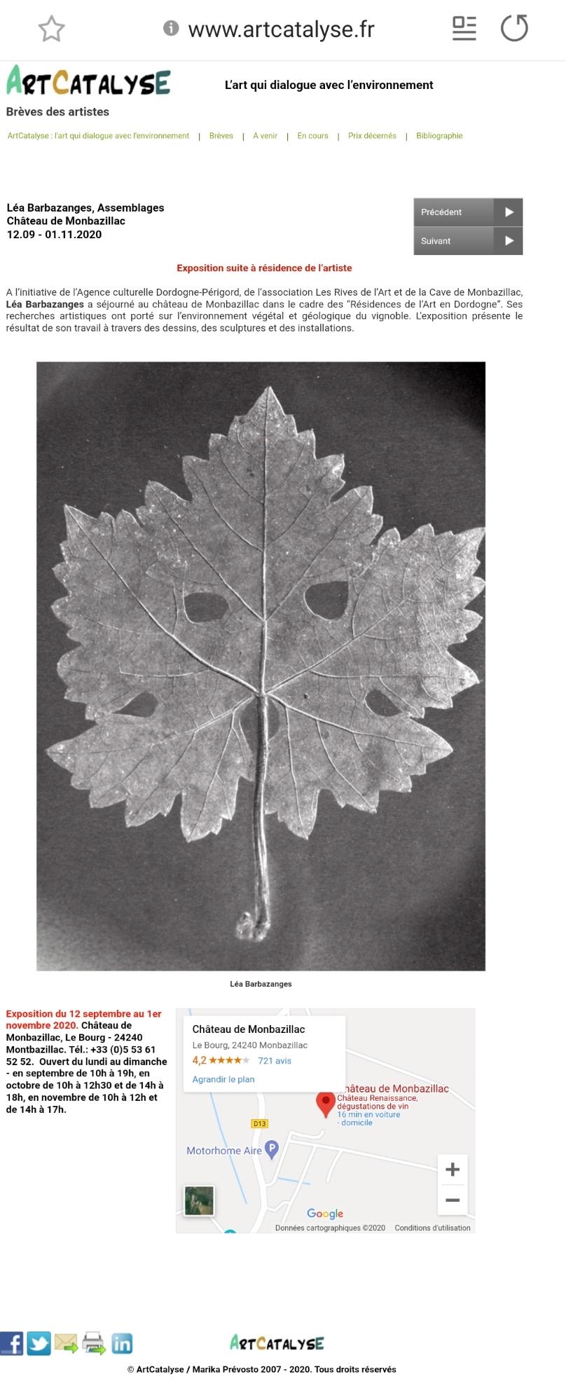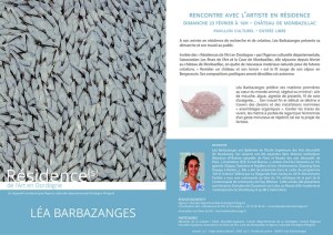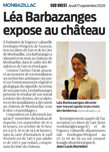 Au château de Monbazillac, propriété de cinquante viticulteurs de la Cave coopérative de Monbazillac, Léa Barbazanges a porté son regard sur les vignobles de ce remarquable terroir. Elle a orienté ses travaux sur les caractéristiques végétales et géologiques qui donnent corps à ce célèbre vin Le Monbazillac. Actuellement, à l’étape de la réalisation, elle prépare des dessins et des installations, utilisant notamment l’anthocyane, un pigment végétal de feuilles, de pétales et de fruits, qui seront réunis lors de l’exposition « Assemblages » prévue au Château de Monbazillac.