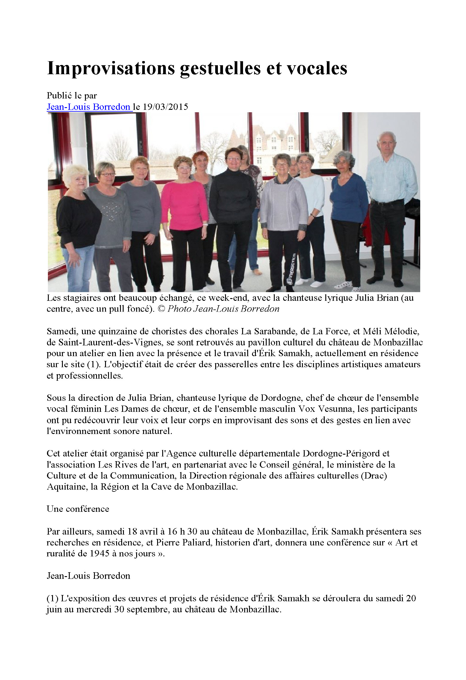 Sous la direction de Julia BRIAN, chanteuse lyrique (contralto) et chef de choeur, une quinzaine de choristes de la région de Bergerac ont improvisé des sons et des gestes. Cet atelier était en lien avec l’environnement sonore naturel et le travail d’Erik SAMAKH, artiste en résidence au château de Monbazillac dans le cadre des Résidence(s) de l’Art en Dordogne.